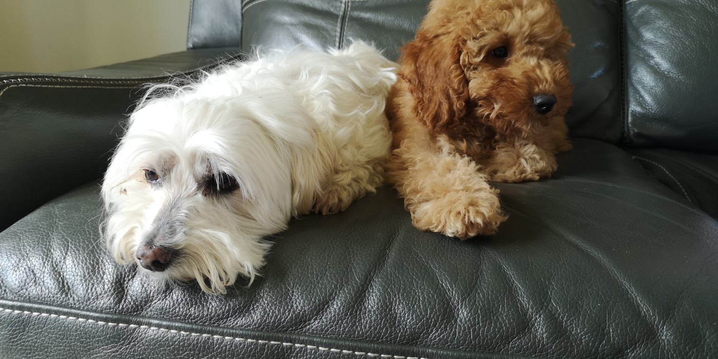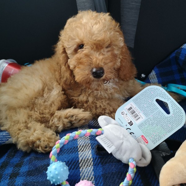 Caniche abricot avec du blanc sur le poitrail